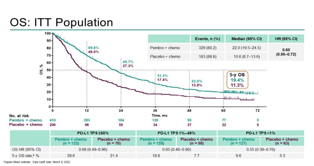 研究结果:共计616例患者入组,免疫治疗组和单纯化疗组分别有410例和206例患者,数据截止时间为2022年3月,中位随访时间64.6个月,57.4%的患者交叉接受免疫治疗。两组中位OS分别为22.0个月和10.6个月,HR=0.60,5年OS率分别为19.4%和11.3%;中位PFS分别为9.0个月和4.9个月,HR=0.50,在至少接受一剂研究药物治疗的患者中,3度及以上不良反应发生率分别为72.8%和67.3%。在57例完成35周期Pembrolizumab治疗的患者中,ORR为86.0%,完成治疗后的3年OS率为71.9%。