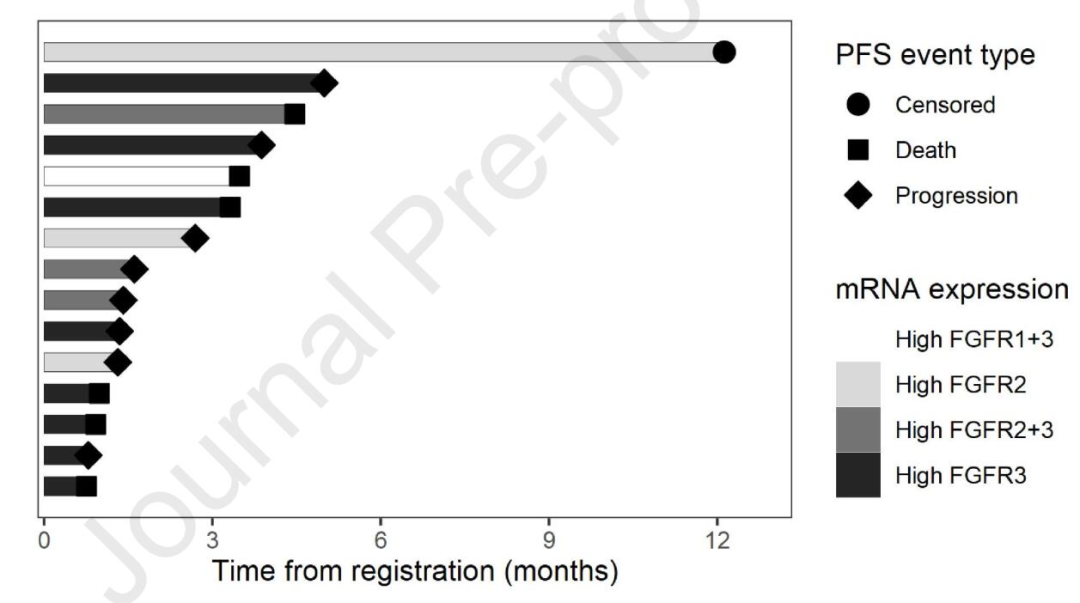 该研究中,共计49例患者接受筛查,20例患者阳性,15例患者入组,FGFR1/2/3的mRNA高表达的患者分别有1例、6例和12例患者。前10例患者入组后,仅有1例患者达到了6个月时疾病仍然未进展,研究被提前终止。15例患者6个月的PFS率为6.7%,中位PFS仅为1.6个月,中位OS仅为3.5个月。从安全性看,全组3度及以上治疗相关不良反应为33%,无治疗相关的死亡事件出现,1例患者因治疗相关的不良反应而导致治疗终止,另有60%的患者因不良反应而导致剂量下调,另有60%的患者出现严重不良反应。