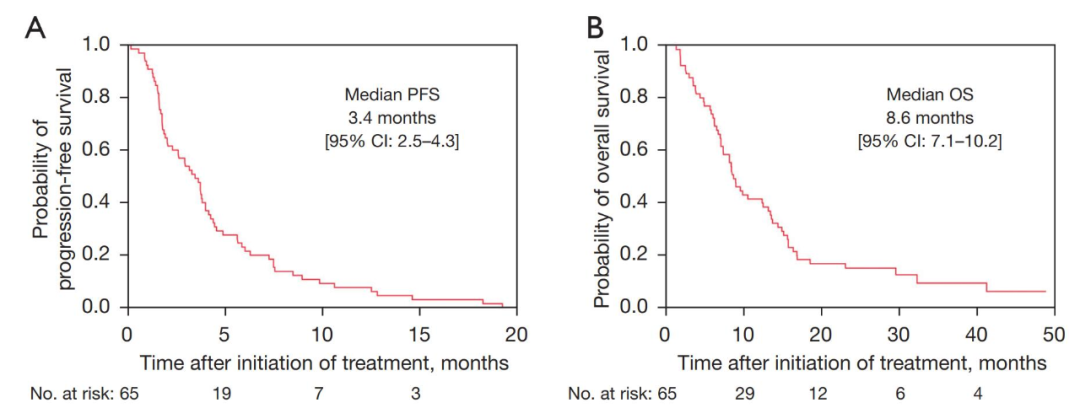 最终,共计65例患者入组,77%为男性;中位年龄69岁;66%的患者诊断为腺癌;分别有63.1%和36.9%的患者在二线和三线接受白蛋白结合型紫杉醇治疗。全组患者ORR和DCR分别为18.5%和61.5%,中位PFS和OS分别为3.4个月和8.6个月。鳞癌患者以及既往接受过吉西他滨治疗的患者,具有较好的PFS(P=0.0346)和更好的OS(P=0.0235)。从安全性看,治疗相关的3度及以上血液学不良反应包括中性粒细胞下降(30.8%)、淋巴细胞下降(23.1%)、贫血(1.5%);非血液学3度及以上治疗相关不良反应包括感染(7.7%)、低钠血症(4.6%)、ALT升高(1.5%)及乏力(1.5%)。6.2%的患者出现粒细胞缺乏性发热。