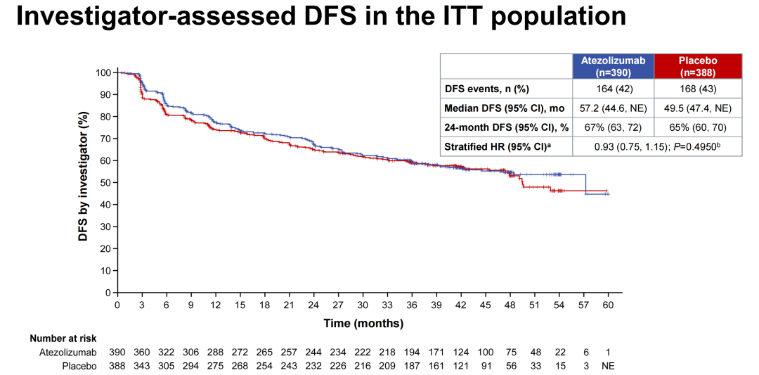 共778例患者被随机分配至阿替利珠单抗组(n=390)或安慰剂组(n=388)。截止2022年5月3日,中位随访时间44.7个月,阿替利珠单抗组的中位INV-DFS为57.2个月,安慰剂组为49.5个月,两组之间没有统计学差异(HR 0.93;95%CI:0.75~1.15;P=0.495);两组的中位总生存OS也没有统计学差异,分别是54个月和53个月(HR 0.97)。值得肯定的是,阿替利珠单抗阿的安全性较好,试验组和对照组分别有27%(106/390)和21%(81/383)发生Gr 3/4不良事件。