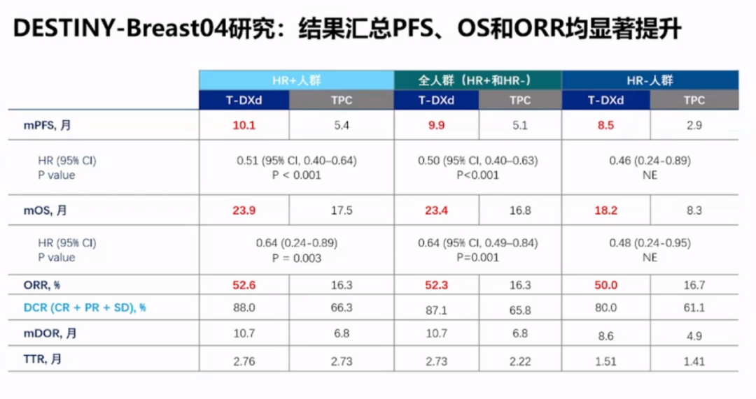 Ⅲ期DB-04研究探索了T-DXd在HER2低表达乳腺癌患者的治疗疗效,研究入组患者既往中位治疗线数为3线,70%的患者接受过CDK4/6抑制剂治疗。研究结果显示,T-DXd较医生选择的方案无论在HR+人群、HR-人群及全人群中均取得了PFS和OS的改善。HR+人群mPFS达到10.1个月,OS达到23.9个月;亚组分析显示,无论在CDK4/6抑制剂经治人群还是HER2低表达TNBC人群,T-DXd在所有亚组均取得一致的获益。