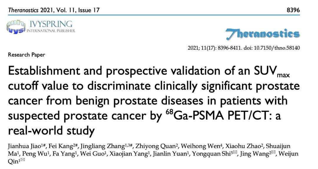 西京医院真实世界研究:通过68Ga-PSMA PET/CT建立及前瞻性验证SUVmax截断值以区分疑似前列腺癌患者的临床显著前列腺癌和良性前列腺疾病