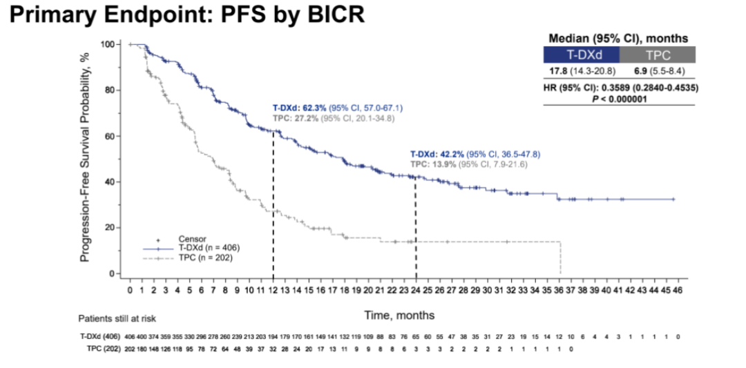 研究结果显示,T-DXd组患者的中位PFS为17.8个月,而TPC组患者的中位无进展生存期为6.9个月(HR 0.3589),疾病进展或死亡风险降低了64%。接受T-DXd治疗的患者中,42%的患者在两年后无进展,而接受TPC治疗的患者中,两年后无进展的比例为13.9%。在一年治疗后,89.4%接受T-DXd治疗的患者存活,而接受TPC治疗的患者中有74.7%存活。