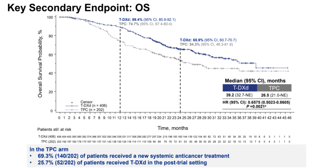 OS数据显示,T-DXd组患者的中位OS为39个月,TPC治疗组患者的中位OS为26.5个月(HR 0.66),与TPC组相比,T-DXd组的死亡风险下降34%。