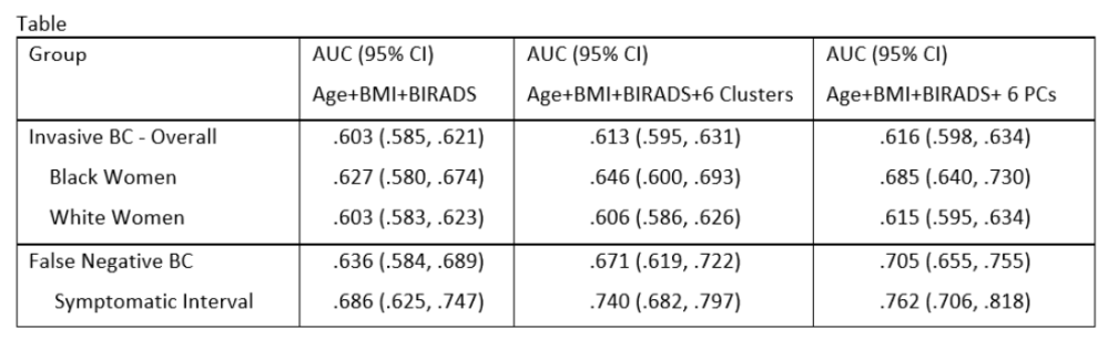 本研究确定了与侵袭性乳腺癌风险相关的、具有可重复性的影像组学特征,其效果超越了乳腺密度,并且这种影像组学特征与有症状间期癌及黑人女性的侵袭性乳腺癌的相关性最大。