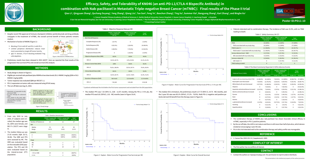 编者按:三阴性乳腺缺乏特异性的治疗靶点,化疗和靶向治疗不尽如人意,患者具有恶性程度高、侵袭性强、复发率高等特点,预后较差。为改变三阴性乳腺癌诊疗现状,乳腺癌领域专家一直在进行探索。2022年SABCS大会上,中国医学科学院肿瘤医院徐兵河院士团队牵头国内多家肿瘤医院和医学中心共同投稿的一篇文章入选了大会焦点壁报(摘要号:PD11-10,题目:Efficacy,Safety,and Tolerability of KN046(an anti-PD-L1/CTLA-4 Bispecific Antibody)in combination with Nab-paclitaxel in Metastatic Triple-negative Breast Cancer(mTNBC):Final results of the Phase II trial),介绍了新型肿瘤免疫治疗药物KN046联合化疗在三阴乳腺癌的Ⅱ期临床最新研究结果。