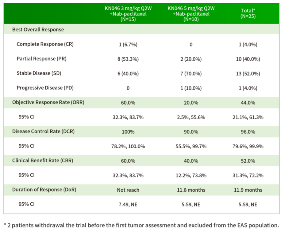 研究结果表明,KN046耐受性良好;KN046联合白蛋白结合型紫杉醇对晚期三阴乳腺癌患者有效,无论患者的PD-L1是否阳性,都显示出无进展生存期(PFS)和总生存期(OS)获益。