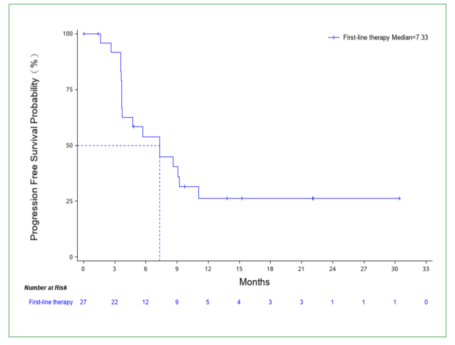 27例患者的中位无进展生存期(PFS)为7.3个月(95%CI:3.7~11.1),PD-L1阳性受试者的中位PFS可达8.6个月(95%CI:1.6~NE)。中位总生存期(mOS)的初步结果为27.7个月(95%CI:14.8~NE),24个月OS率为60.1%(95%CI:37.2~76.9%)。