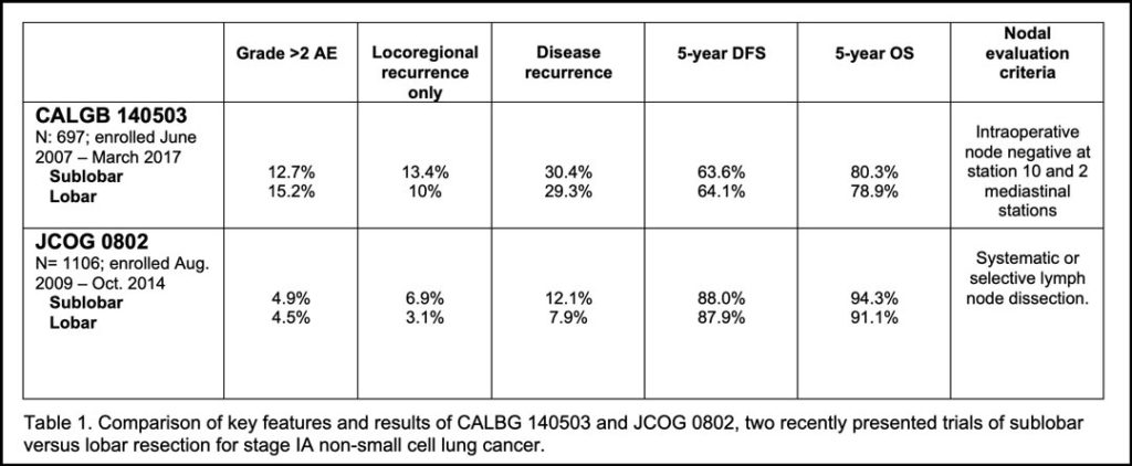 两项试验(CALGB 140503和JCOG0802)和第三项试验的受试者分析提供了说明了这一问题的机会。最近两项改变临床实践的试验——北美CALGB 140503和日本JCOG0802比较了亚肺叶切除术和肺叶切除术治疗肿瘤≤2cm周围型NSCLC(根据第8版TNM分期为IA1和IA2期)患者的效果。这两项试验得出了相同的结论:在高度选择的患者中,接受亚肺叶切除术可获得与肺叶切除术相似或更优的生存率。