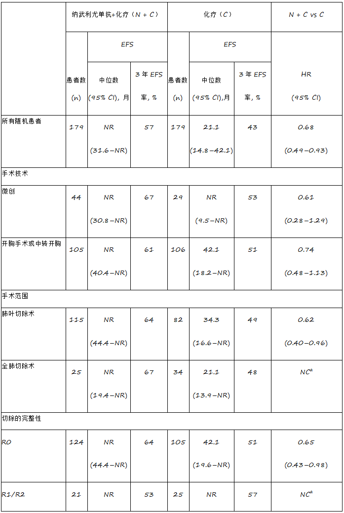 切除程度:纳武利尤单抗+化疗与单独化疗相比的3年EFS率改善,也不取决于手术切除程度。在接受肺叶切除术的患者中,纳武利尤单抗+化疗vs化疗的中位EFS为NR和34.3个月,3年EFS率分别为64%vs 49%;在接受全肺切除术的患者中,中位EFS分别为NR和21.1个月,3年EFS率为67%vs 48%。并且3年EFS获益在完全(R0)切除的患者中明显,在R0切除患者中,纳武利尤单抗+化疗vs化疗的3年EFS率为64%vs 51%(HR=0.65;95%CI:0.43-0.98)。