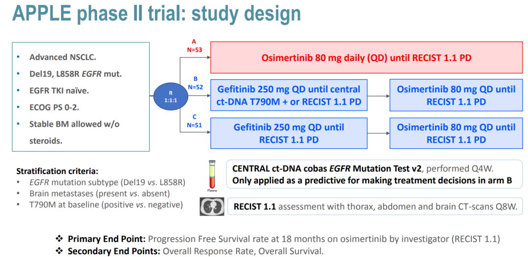APPLE研究是一项在初治EGFR突变非小细胞肺癌(NSCLC)患者中开展的随机、非比较、开放标签、3臂的Ⅱ期研究,旨在探索奥希替尼作为一线治疗的预后意义,并通过ctDNA监测血浆EGFR T790M,用于判断吉非替尼转换至奥希替尼最佳时机的可行性。入组患者随机分为3组: