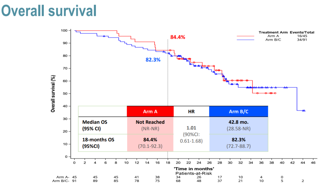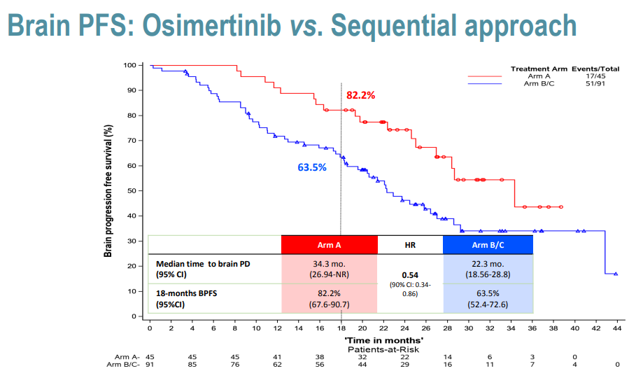 首先,今年APPLE研究A组数据的公布再次表明了奥希替尼一线应用对于降低颅内进展风险的绝对优势(HR=0.54),18个月时的BPFS率分别为82.2%和63.5%,改善了患者的生存质量。另外,从总生存来讲,目前该研究结果中A组的中位OS尚未达到,B/C组为42.8(95%置信区间:28.6-未达到)个月,18个月时的OS率分别为84.4%和82.3%。结合FLAURA研究及AURA3研究,我们不难看到尽早使用奥希替尼对于EGFR阳性NSCLC患者总生存的贡献。