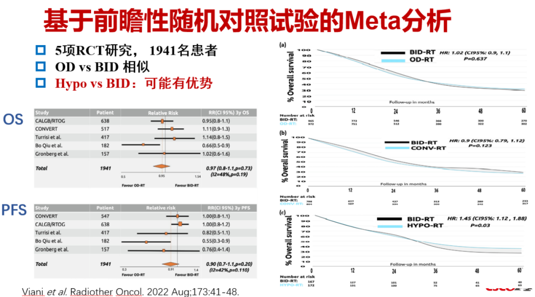 超分割方案在实际临床应用中并未达成共识,精确调强放疗技术可显著提高疗效,降低毒副作用。根据2022年刊登于Radiother Oncol期刊的一项纳入5项RCT研究(n=1941)的Meta分析,对于局限期SCLC,每天一次(OD)常规放化疗与每日两次(BID)放化疗的疗效相似,而大分割放疗的总生存(OS)和无进展生存(PFS)似乎优于BID放化疗。