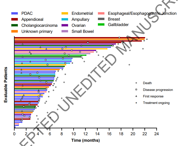 在57例基线有可测量病变的患者中,20例(35.1%)观察到客观缓解,均为部分缓解(PR),其中21例胰腺肿瘤中有7例PR(33.3%),12例胆道肿瘤中5例PR(41.7%)。