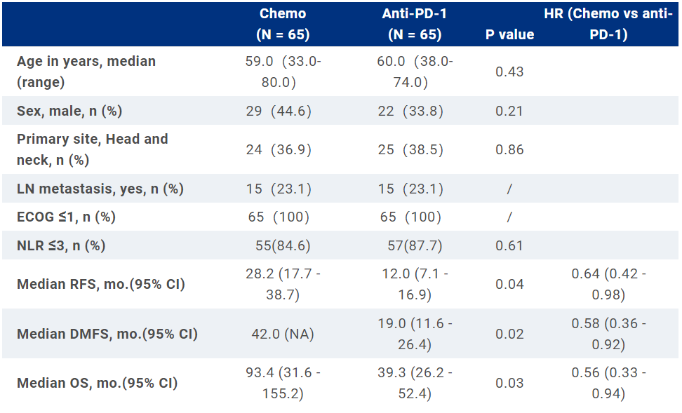 共纳入247例患者,其中特瑞普利单抗组78例,化疗组169例。PSM对两组各65例患者进行了匹配。基线特征相似。在52.6个月(95%CI:44.6~60.6)的中位随访中,与特瑞普利单抗组相比,接受化疗的患者中位RFS(28.2 vs 12.0;HR 0.64,95%CI:0.42~0.98,P=0.04),DMFS(42.0 vs 19.0;HR 0.58,95%CI:0.36~0.92,P=0.02)和OS(93.4 vs 39.3;HR 0.56,95%CI:0.33~0.94,P=0.03)更长。