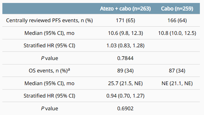 1)CONTACT 03研究表明,卡博替尼联合阿替利珠单抗治疗较卡博替尼单药并未对mRCC患者产生获益。