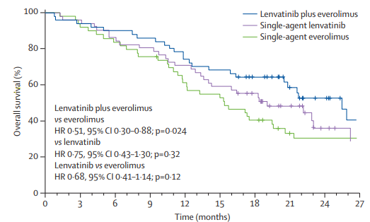 在靶向联合靶向治疗方面,STUDY205研究进行了探索。该研究为仑伐替尼单药或联合依维莫司二线治疗转移性肾细胞癌的随机、Ⅱ期、开放、多中心临床试验,研究结果表明仑伐替尼联合依维莫司相比于依维莫司单药,可显著延长PFS(14.6 vs.5.5个月)和OS(18.5 vs.16.5个月)[2]