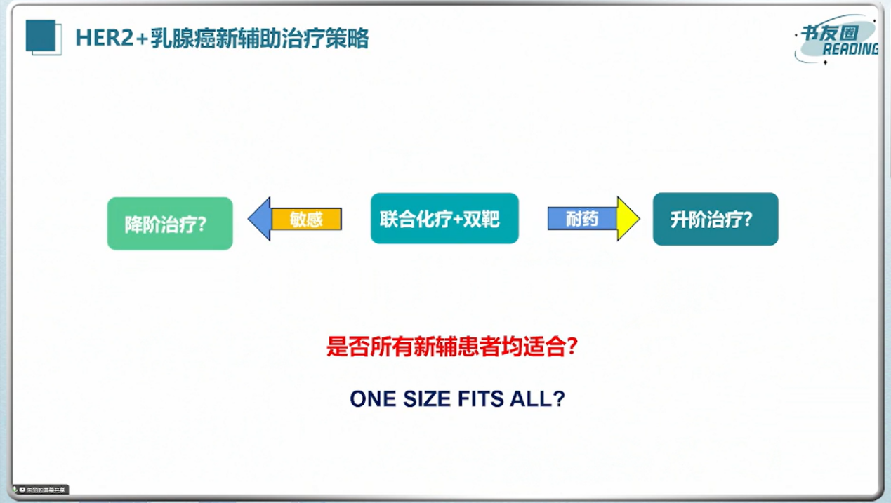 张强教授:不是所有pCR结果都能用于预测患者长期生存获益。追溯pCR这一疗效终点的设置并不是服务于EFS和OS,而是作为早期乳腺癌新辅助治疗适应症加速批准的替代终点。在随后的相关研究中,我们也确实看到了达到pCR和未达到pCR的患者在长期生存上存在差别,通常来说,达到pCR的患者EFS和OS较好,但在临床实践中我们也看到不是所有达到pCR的患者预后都那么好,生存结局仍然存在差异。因此,我们需要对pCR进行辩证的分析。在HER2阳性相关研究的亚组分析中我们发现,HR+/pCR患者长期预后较好,肿瘤大小和淋巴结对其预后影响不大,pCR结果可以用于预测患者长期生存获益;对于HR-/non-pCR患者来说,N+是其主要影响因素,治疗前基线状态更是影响预后的重要因素,因此,这样的pCR仅可以作为患者疗效考核指标,不能用来预测患者长期生存获益,就算新辅助后达到pCR也要行抗HER2升阶梯治疗。