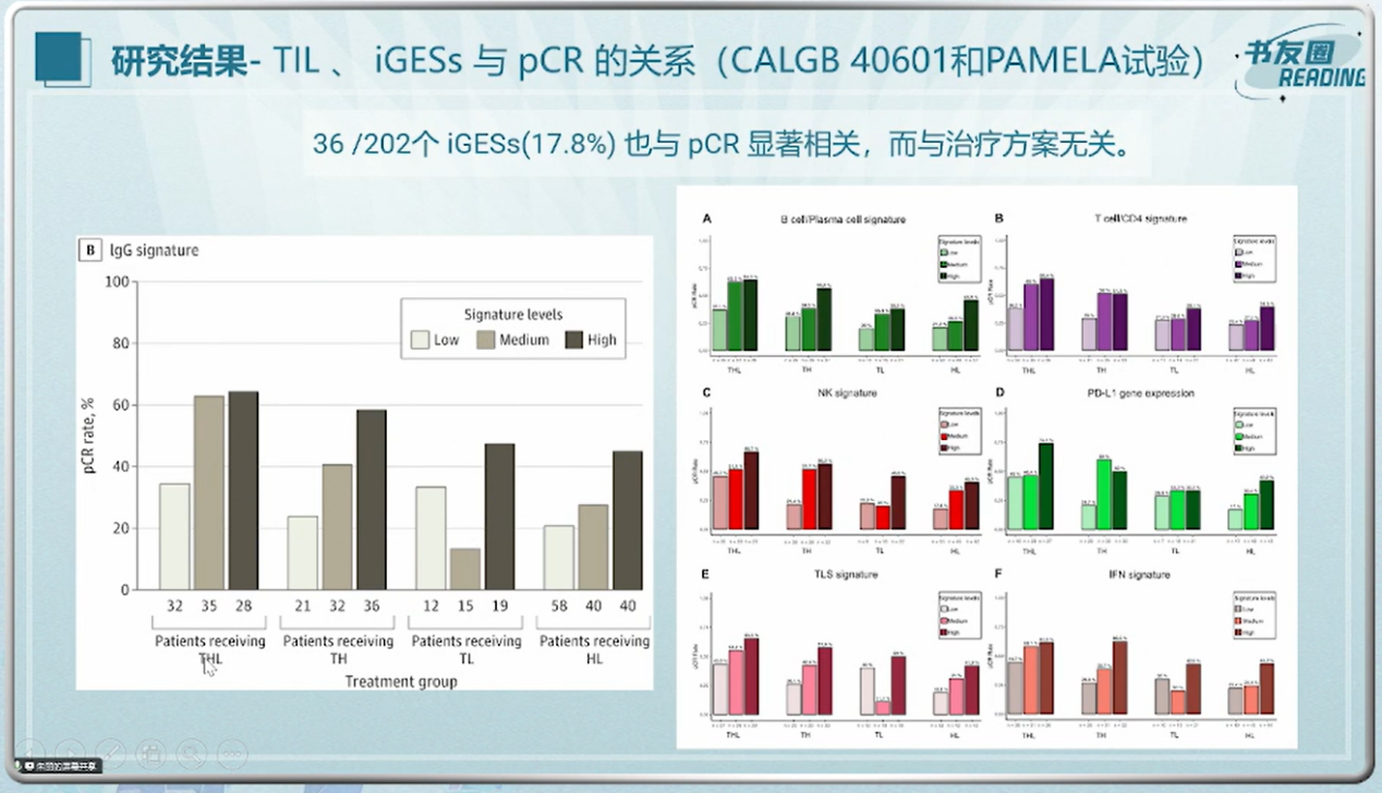 朱丽教授:存在两种免疫生物标志物类型时,iGESs(尤其B细胞相关标记物)在pCR和EFS预后预测方面优于TILs;二者组合并不能提高预后价值。