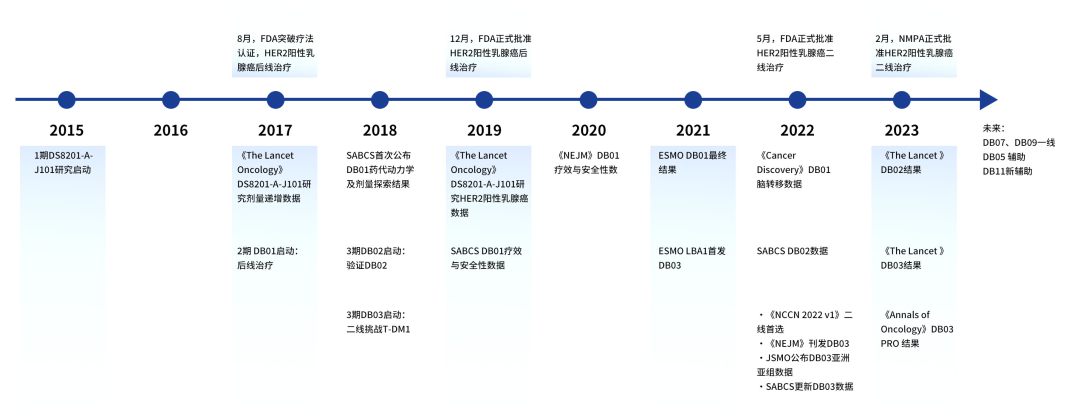 基于DS8201-A-J101早期的研究结果,在2017年8月30日,美国食品药品监督管理局(FDA)首次授予了T-DXd突破性疗法认证,用于既往接受过曲妥珠单抗和帕妥珠单抗治疗,并在T-DM1治疗后出现疾病进展的HER2阳性、局部晚期或转移性乳腺癌患者。