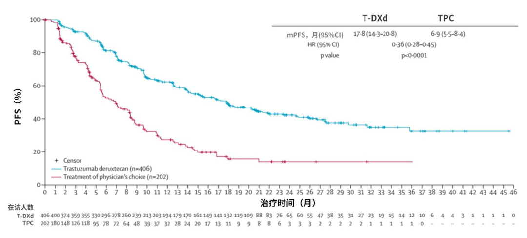 图4 DESTINY-Breast02研究T-DXd组与TPC组的PFS