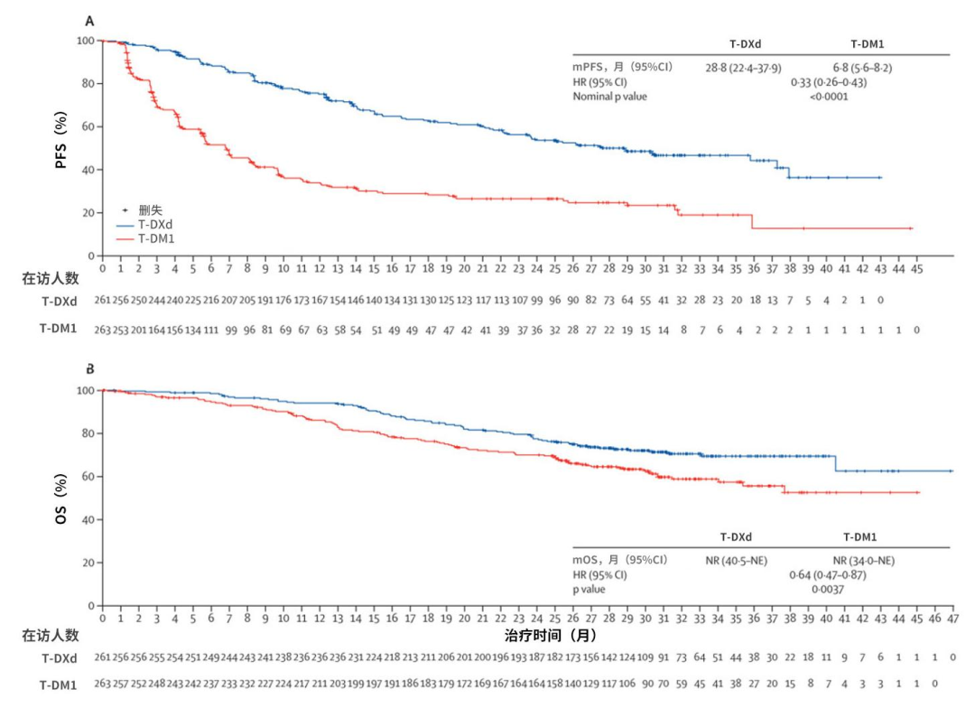 2022年12月SABCS会议更新了更长时间随访后DESTINY-Breast03研究的数据[20],并于2023年初发表在《The Lancet》[21]。T-DXd组中位随访28.4个月,T-DM1组随访26.5个月,最新结果显示:T-DXd组vs T-DM1组,BICR评估的mPFS为28.8个月vs 6.8个月(HR=0.33,95%CI 0.26-0.43,p<0.0001),ORR为78.5%vs 35.0%,CR为21.1%vs 9.5%,mDOR为36.6个月vs 23.8个月,mOS尚不成熟,但总体死亡风险降低了36%(HR 0.64;95%CI 0.47-0.87];p=0.0037)。