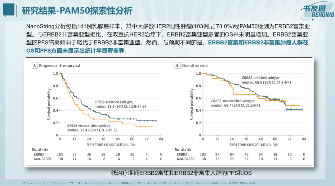 安全性方面,除血液学毒性外,大多数不良事件(AE)为1级或2级,且在化疗患者中几乎未见发热和过敏反应外的AE。一线治疗期间,B组仅中枢神经系统进展性疾病较多,曲妥珠单抗+T-DM1耐受性良好,未发现新的安全性信号。NanoString分析包括141例乳腺癌样本,其中大多数HER2阳性肿瘤(103例,占73.0%)经PAM50检测为ERBB2富集亚型。与ERBB2非富集亚型相比,在双重抗HER2治疗下,ERBB2富集亚型患者的OS并未明显增加。ERBB2富集亚型的PFS结果倾向略优于ERBB2非富集亚型。然而,与预期不同的是,ERBB2富集和ERBB2非富集肿瘤人群在OS和PFS方面未显示出统计学显著差异。