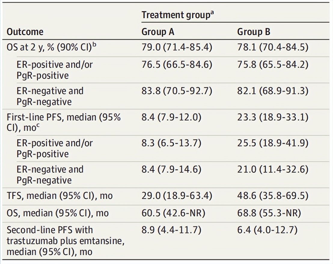 A组患者治疗方案:帕妥珠单抗(负荷剂量840 mg静脉注射[IV],随后420 mg IV,每3周一次)+曲妥珠单抗(负荷剂量8 mg/kg IV,随后6 mg/kg IV,每3周一次),无化疗,雌激素受体ER阳性的联合内分泌治疗。B组患者治疗方案:帕妥珠单抗+曲妥珠单抗+紫杉醇(第1、8和15天90 mg/m2,每4周一次,持续≥4个月)或长春瑞滨(首次给药25 mg/m2,随后第1和8天30 mg/m2,然后每3周一次,持续≥4个月),化疗中止后接受帕妥珠单抗+曲妥珠单抗维持治疗,其中ER阳性的可联合内分泌治疗。终点指标:主要终点是24个月OS,次要终点包括一线和二线治疗的PFS、患者报告的QOL和安全性。