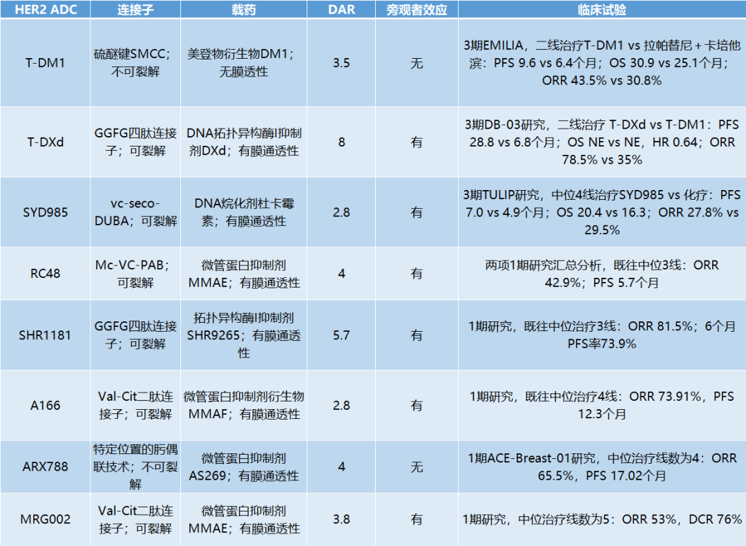 RC48的载药为微管蛋白抑制剂单甲基澳瑞他汀E(MMAE),具有膜通透性,但紫衫经治患者易产生耐药;其连接子是可裂解的Mc-VC-PAB,使其具有旁观者效应;RC48的DAR为4,但均质性相对更差。1期C001 CANCER、C003 CANCER研究的汇总分析中,RC48(2.0 mg/kg)治疗HER2+MBC的中位PFS为5.7个月,中位ORR为42.9%[6];目前2期研究正在开展中。