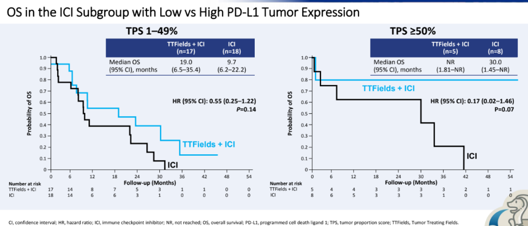 研究人员基于PD-L1表达水平分析了PD-L1表达与疗效之间的相关性。在PD-L1阳性(TPS≥1%)患者中,接受TTFields联合ICI治疗与单独接受ICI的患者相比,OS获益更为明显,两组的中位OS分别为23.6个月(95% CI: 7.7~未达到)和10.5个月(95% CI: 7.5~26.6)。在PD-L1低表达(TPS 1-49%)亚组中,中位OS分别为19.0个月vs 9.7个月(HR=0.55,P=0.14);在PD-L1高表达(TPS≥50%)亚组中,中位OS分别为未达到 vs 30.0个月(HR=0.17,P=0.07)。