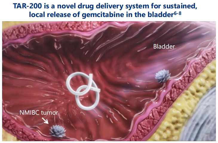 Dr.Andrea Nccchi:TAR200 is a new intravestical delivery system that allows a stable release of gemcitabine through a silicon tube that is,that osmotically released the gemcitabine into the bladder.It’s a small silicon tube that is put into the bladder via a cystoscopy,so a very easy endoscopy procedure,and is removed every three weeks,recharged and then replaced into the bladder.So this way we can allow a continuous exposure of the tumor to the drug,and this is the key of success,so the total exposure time for the tumor to the drug seems to be,to make the key and the differences compared to other ways of installation of chemotherapy or other drugs in this disease.
