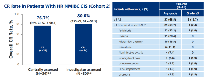Andrea Nccchi教授:SunRISe-1是一项平台研究,旨在评价TAR-200在不同疾病分期膀胱癌单药疗法或与免疫检查点抑制剂cetrelimab(抗PD-1药物)联合治疗。SunRISe-1是一项随机2b期开放标签研究,队列1患者接受TAR-200联合cetrelimab,队列2单独TAR-200,队列3接受单独cetrelimab治疗,还有一个额外的队列4正在招募患者。该研究入组患者为乳头状、高风险、非肌层浸润性疾病的患者。重要的是,队列1、2和3还纳入了原位癌(CIS)患者,这些患者都经历了卡介苗(BCG)灌注失败,可以定义为BCG无反应性疾病,且拒绝或不适合根治性膀胱切除术。此处报告队列2数据,入组患者前24周接受TAR200每三周一次,然后改为每12周一次直至第96周。主要终点是总体的完全缓解(CR)率,在第24周和48周通过尿液细胞学和活检进行评估。终点的定义是非常严格的。