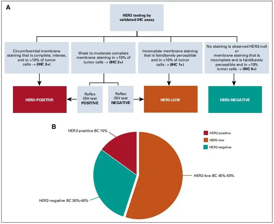 根据ASCO/CAP发布的HER2检测指南[1],HER2阳性乳腺癌定义为:至少一个肿瘤样本IHC评分为HER2 3+或ISH存在HER2过度表达或基因扩增。按照此定义,临床中仅有15%的乳腺癌患者为“HER2阳性”,而实际上仍有高达45%~55%的患者为“HER2低表达”,即IHC评分为HER21+或2+且ISH阴性的患者[2]
