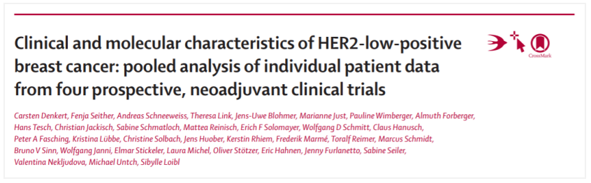 尽管抗HER2治疗极大改善了HER2阳性乳腺癌患者的预后,但仍有很大一部分HER2低表达患者并未从抗HER2治疗中显著获益。为了进一步描述这种新的乳腺癌亚型的特征,2021年7月9日,柳叶刀肿瘤学分册(Lancet Oncol.)发表的一项研究比较了HER2低表达(HER2-low-positive)和HER2零表达(HER2-zero)乳腺癌的临床和分子特征,包括对新辅助治疗的反应和预后[3]