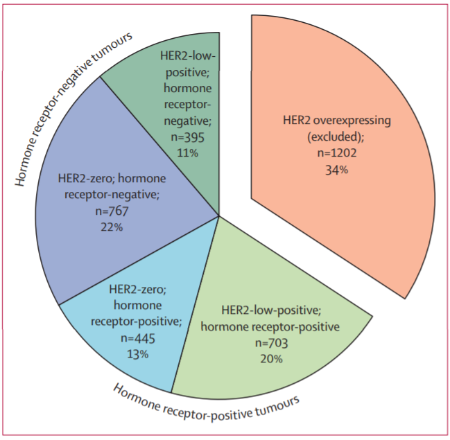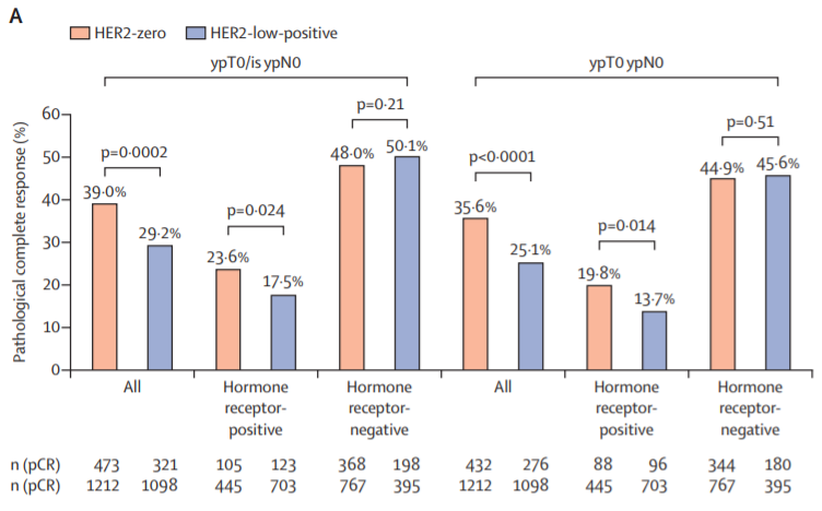 该研究对2012年7月30日至2019年3月20日期间的4项前瞻性新辅助治疗临床试验(GeparSepto,NCT01583426;GeparOcto,NCT02125344;GeparX,NCT02682693;Gain-2 neoadjuvant,NCT01690702)的2310例患者进行汇总分析。其中,HER2低表达1098例,HER2零表达1212例(47.5%vs 52.5%)[3]