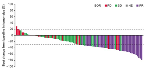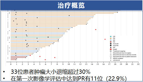 结果显示,ORR为34.7%(95%CI 25.3~45.2);DCR为72.6%(95%CI 62.5~81.3);中位缓解持续时间(DOR)为5.6个月(95%CI 2.9~8.3);中位PFS为4.2个月(95%CI 3.5~5.6)(图5~6)。安全性方面未出现导致死亡的治疗相关不良事件(图7)。此次更新也体现了对特定突变类型患者的个体化治疗策略的重视。