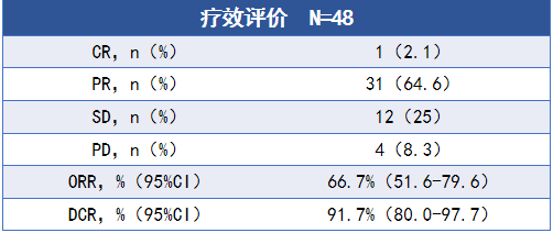 结果显示,33例患者肿瘤大小退缩超过30%;在第一次影像学评估中达到PR有11例(22.9%)(图1)。疗效方面,ORR达到66.7%(95%CI 51.6~79.6),DCR为91.7%(95%CI 80.0~97.7)(图2),意向治疗(ITT)人群中位PFS为18.4个月(95%CI 10.6~未达到),中位OS未达到(95%CI,未达到-未达到)。相较于LDH高表达和疗效为疾病稳定(SD)的患者,LDH低表达组和PR的患者在PFS和OS上获益更明显(P<0.05)(图3)。卡瑞利珠单抗+阿帕替尼+替莫唑胺联合治疗表现出积极的抗肿瘤活性且安全性可控(图4)。此次更新的推荐意味着这种联合治疗方案在疗效和安全性方面得到了更多的认可,并有可能成为未来治疗该类型黑色素瘤的首选方案之一。