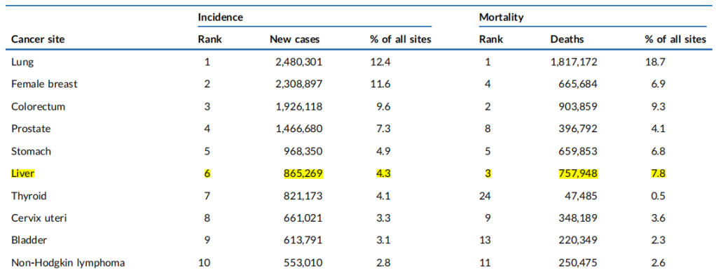最新公布的全球癌症统计数据显示,2022年,全球有超过75万人死于肝癌,使肝癌成为仅次于肺癌和结直肠癌的第三大癌症死亡原因,也是第六大常见诊断癌症,估计2022年有86.5万新发病例和75.8万死亡病例[1]