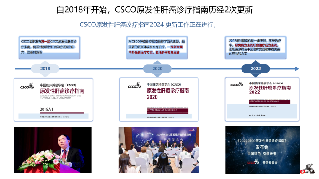 自2018年起,CSCO原发性肝癌诊疗指南历经两次重要更新,2024年版的更新工作也在积极进行中。2018年,CSCO首次发布原发性肝癌诊疗指南,该版指南重点对原发性肝癌诊疗规范进行了补充。2020年,CSCO对指南进行了首次更新,其中最为关键的变化是在全身治疗方面,一线治疗中新增了多种国内外最新的治疗方案,包含了多种靶向药物和免疫治疗的联合应用。在2022年的更新中,系统治疗方面以免疫治疗为主的联合治疗策略成为了主流,同时纳入了更多符合中国临床实践和患者需求的治疗方案和药物,体现了指南在不断演进中的精准化和个性化治疗理念。