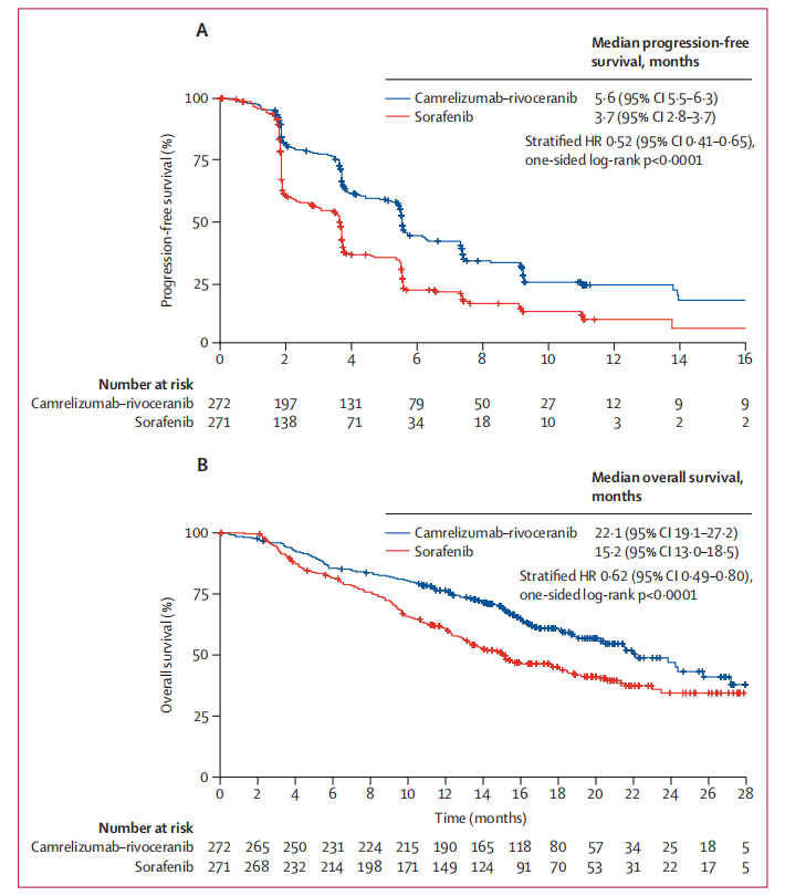 结果显示,C+R组的中位PFS(5.6 vs.3.7个月;HR 0.52,P<0.0001)及中位OS(22.1 vs.15.2个月;HR 0.62,P<0.0001)均显著优于索拉非尼组;在预设的亚组分析以及事后分析中,C+R组的PFS、OS同样显示出优于索拉非尼组的趋势。与索拉非尼组相比,C+R组缓解率更高(mRECIST ORR:33.1%vs.10.0%)、起效更快[至缓解时间(TTR):1.9 vs.3.7个月]、药效更持久(DoR:14.8 vs.9.2个月)。安全性方面,C+R组和索拉非尼组最常见的3级或4级治疗相关不良事件(TRAE)包括高血压(38%vs.15%)、手足综合征(12%vs.15%)、谷草转氨酶(AST)升高(17%vs.5%)和谷丙转氨酶(ALT)升高(13%vs.3%)。
