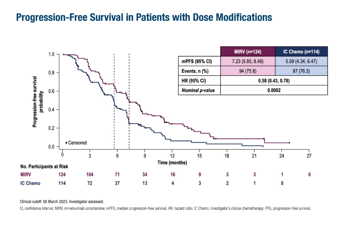 在这些剂量调整的患者中,MIRV治疗组的无进展生存期(PFS)明显更长,中位PFS分别为7.23和5.59个月(风险比<hr/>=0.58;95%置信区间[CI]:0.43–0.78;名义P=0.0002)。MIRV治疗还显示出优于化疗的总生存(HR=0.45;95%CI:0.30–0.68;名义P=0.0001)以及更佳的客观缓解率(ORR分别为60%和26%)。